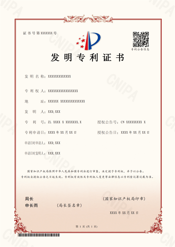 For patents with an authorization announcement date on or after June 1, 2024, the CNIPA will issue a new version of the patent certificate. The new patent certificate continues to use the A4 size vertical layout and optimizes the arrangement of bibliographic details.